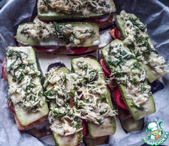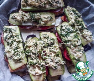 Поверх помидоров кладем кабачок. И заливаем заправкой. Отправляем в духовку на 20 минут.