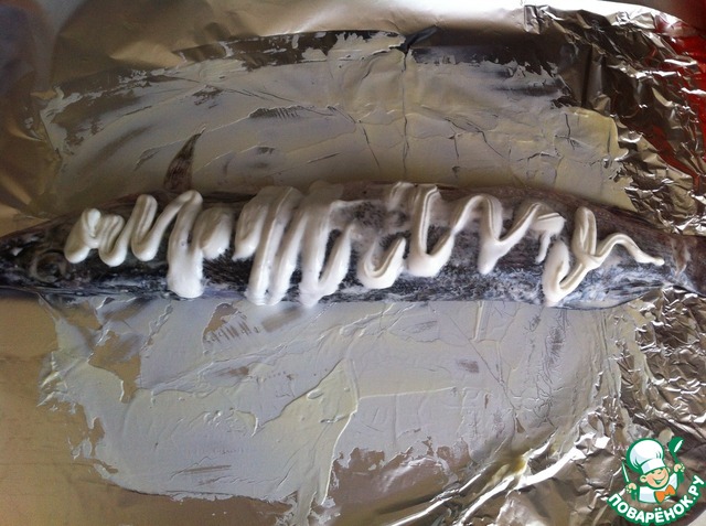 Завернуть рыбку в фольгу и положить на противень швом вверх, что бы сок не вытекал. И запечь при температуре 180 С минут 30, затем открыть фольгу и оставить для подрумянивания минут на 10.