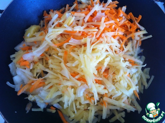 Тем временем, овощи почистить, промыть и потереть на крупной терке. Обжарить на растительном масле минут 7. Оставить остывать.