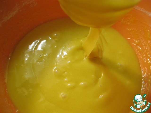 Желтки смешиваем с растительным маслом, вместе разрыхлителем добавляем к нашему тесту и снова перемешиваем. У меня яйца домашние - желтки ооочень яркие!