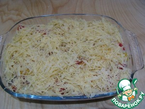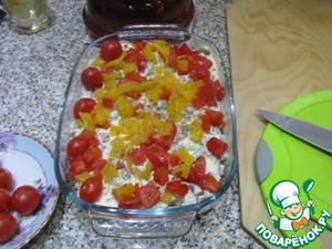 Следующий слой по периметру помидоры черри, а остальную площадь покрываем подготовленными перцами.