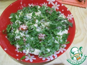 Достаем салат, берем необходимое количество и в отдельной посуде перемешиваем, посыпаем рубленой зеленью, подаем к столу.