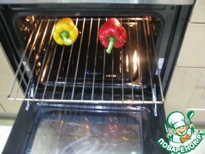 Ставим перцы запекаться в духовку при 220*С, на решетку, на 15-20 минут, каждые 5 минут переворачиваем.