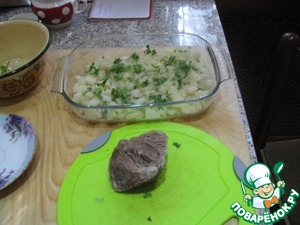 Вот здесь наступила очередь майонеза. Половину порции майонеза распределяем по поверхности мяса, забыла сделать фото. -