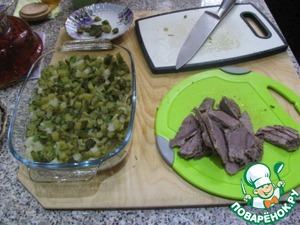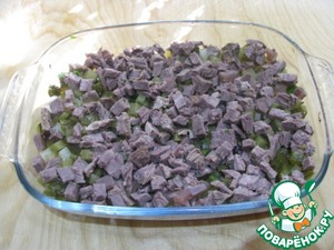 Следующий слой - маринованные огурцы (если нет маринованных, используйте плотные соленые, чтобы не было лишней жидкости), режем так же аккуратными, небольшими кубиками.