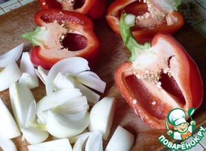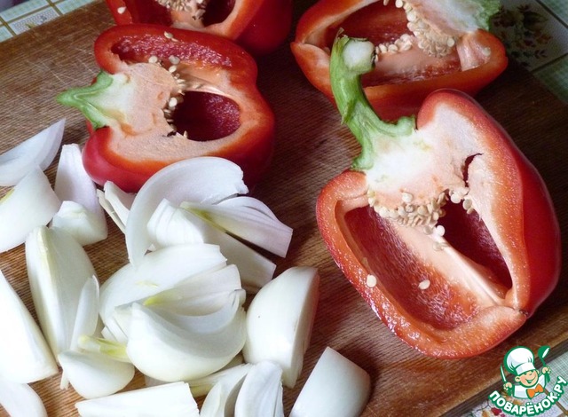 Овощи помыть, обсушить. Почистить лук и перец. Лук нарезать вдоль на 6-8 частей, перец на 4 части.
