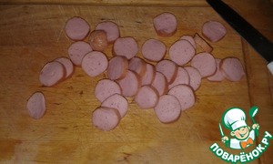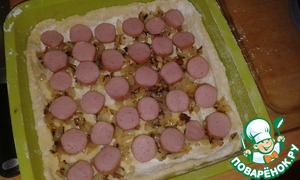 Тонкое рассыпчатое тесто, а на нем нежнейшее гороховое суфле с ароматом укропа и легкой остринкой чесночка, под которым скрывается обжаренный лучок и сосиска.