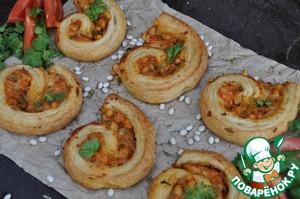 Застилаем противень силиконовым ковриком для выпечки. Раскатываем тесто в тонкий пласт. Смазываем его по всей поверхности фасолевым соусом, посыпаем сыром и аккуратно сворачиваем лист рулетом. Закрепляем шов и кладем рулет швом вниз. Разрезаем рулет острым тонким ножом на кружочки толщиной 2 см. Выкладываем кружочки плоской стороной на противень на расстоянии друг от друга. Даем рулетам расстоятся.