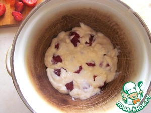 Приступаем к "сборке" торта. Торт получается большой, поэтому я взяла большую кастрюлю. На дно кастрюли выкладываю разрезанную клубнику, по кругу, разрезом вниз. Посередине так же (на фотографии понятней)-первыми должны быть фрукты обязательно! Так как это будет верх нашего торта, и будет очень красиво!