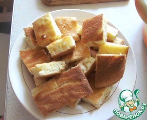 Режем наш уже готовый бисквит на квадратики размером примерно 4 на 4 сантиметра.