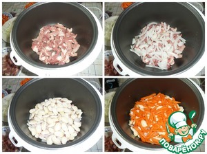 В чашу мультиварки выкладываем слоями : мясо, лук, белую (сырую) фасоль, морковь.