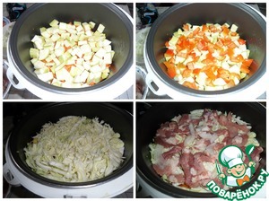 Затем кабачки, перец, капусту и мясо.