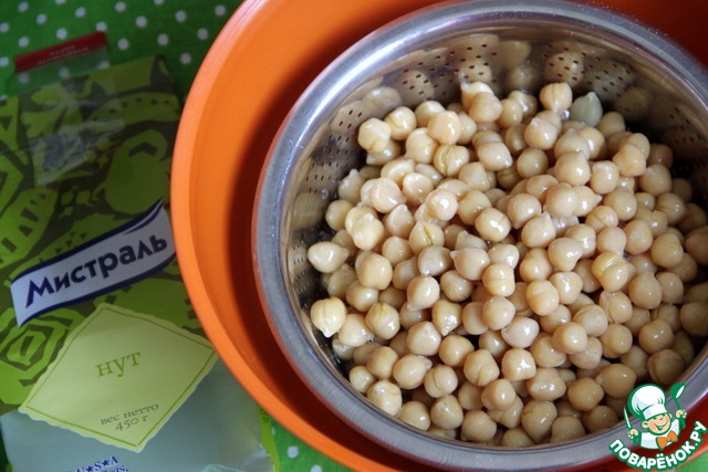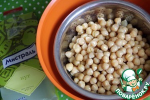 Замочить нут на 24 часа и затем отварить до готовности (ок. 30-40 мин.)