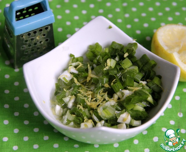 Мелко нарезать зеленый лук и чеснок, добавить оливковое (др. нейтрал. растит. масло) и натереть цедру с 1/4 лимона.