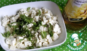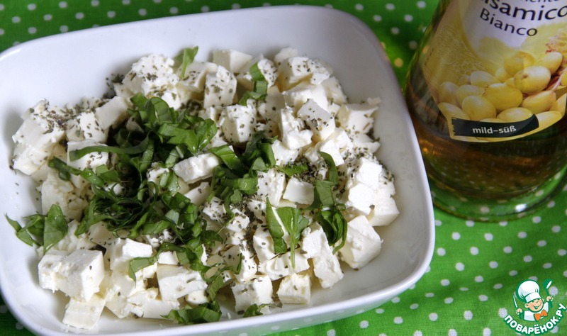 Фету (др. аналог слабосоленой брынзы) нарезать кубиком, добавить сушеный (0,5 ч. л.) и свежий базилик (6 крупных листиков), бальзамический белый уксус. Перемешать.
