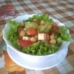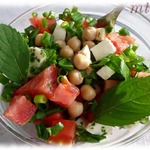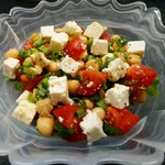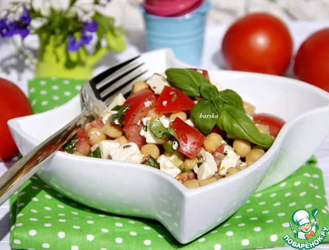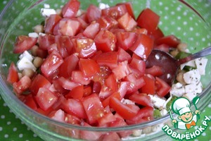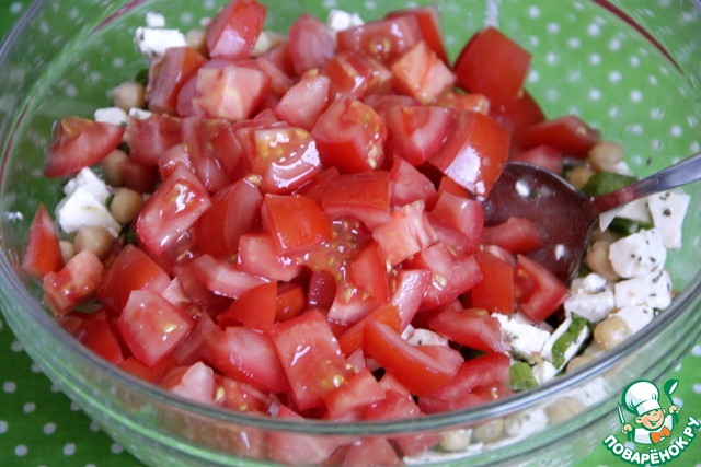 Добавить заготовку из феты в остывшую заготовку из нута, перемешать и освежить томатами, нарезанными кубиком (я люблю сочные салаты, добавляла помидоры - с мякотью), по желанию - без томатной мякоти.