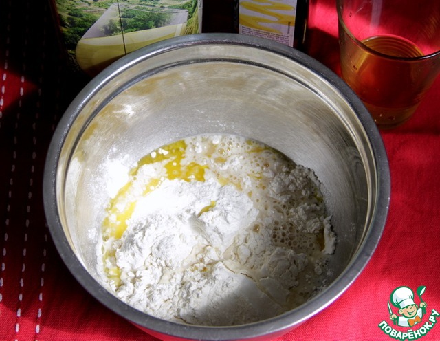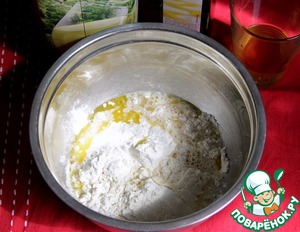 Тесто: просеять 200 гр муки, добавить 1 ст. л. масла и 100 мл вина