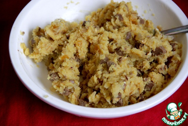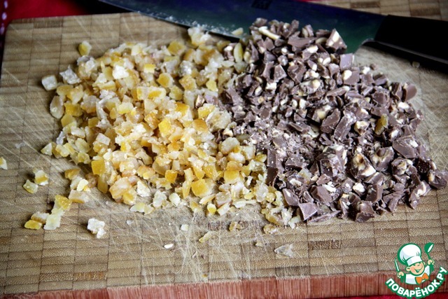 Мелко порубить на кусочки шоколад и цукаты (у меня - апельсиновые, а шоколад - молочный, с орешками)