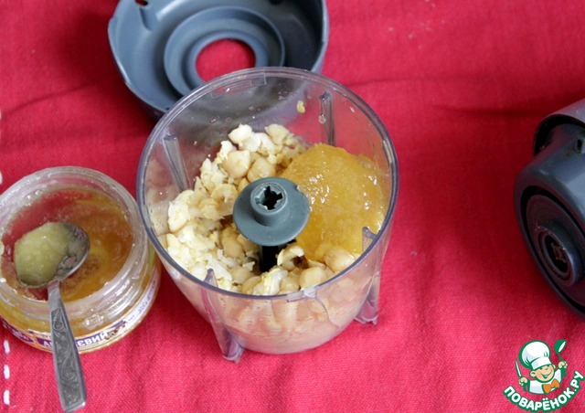 Отвареный нут пюрировать порционно, с добавлением меда (я исп-ла акациевый). Кол-во меда регелируйте под свой вкус и с учетом добавления шоколада.