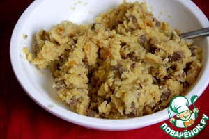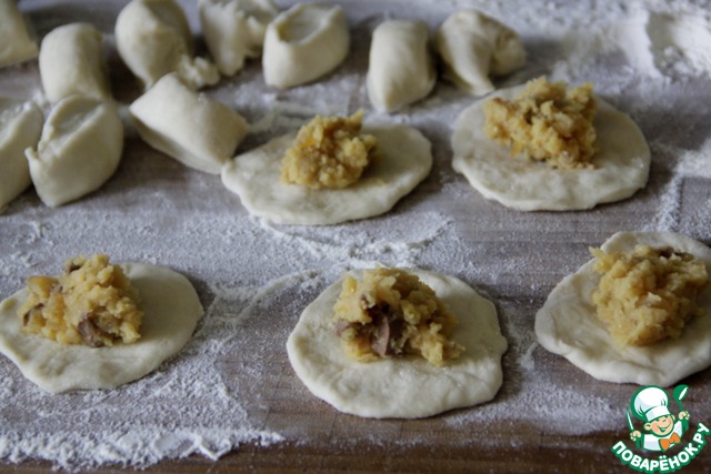 Каждый сегмент расплющить в круглую тонкую заготовку-кружок для печенья и распределить начинку (по 1 ч. л.)