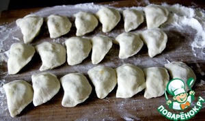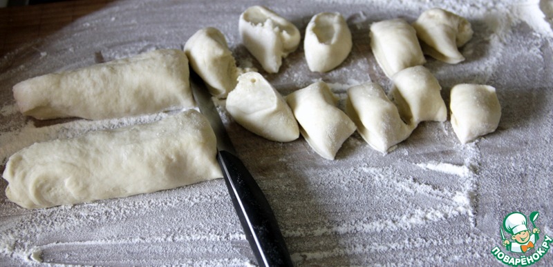 Тесто обмять и сформировать толстые "колбаски", нарезать их равномерно на 20-24 сегмента, величиной в грецкий орех.