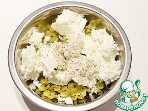 Из остывшего гороха готовлю начинку. К гороху добавляю сливочный творожный сыр, соль и черный молотый перец по вкусу, измельченный чеснок, оливковое масло.