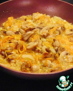 Обжарить на растительном масле пару минут, добавить порезанные грибы (у меня шампиньоны)