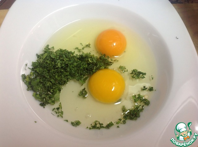 Смешаем 2 яйца с зеленью и солью и добавим на сковороду. Готовим до готовности