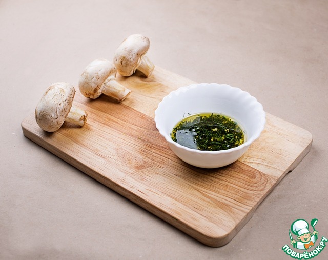 Мариновать, если так можно выразиться, будем только грибы. Для этого измельчаем чеснок (с помощью чеснокодавки получится идеально), мелко нарезаем зелень, заливаем оливковое масло и добавляем соль и перец по вкусу.