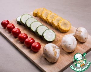 Цукини и кукурузу нарезаем ломтиками средней величины (толщиной, примерно, 1,5 см). Немного подсаливаем.