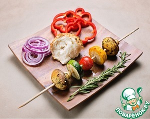А теперь самое интересное: овощи попеременно нанизываем на шампур. И если для мясного шашлыка я использую квадратные деревянные шампуры, то для овощного лучше выбрать круглые шампуры, потому что на них грибы и овощи нанизываются гораздо легче и не вращаются. Получилось подобие овощного светофора с грибами – выглядит очень по-летнему.