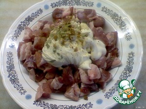 Смешать 200 г майонеза, мелко порезанный чеснок, добавить мелко покрошенный лавровый лист, приправы, соль, перец.