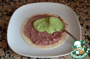 6. Разогреть сухую сковороду на среднем огне. Прогреть одну тортилью по 15 секунд с каждой стороны. Намазать фасолевым кремом, оставляя край 1 см, затем сырной массой.