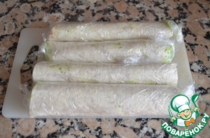 7. Туго свернуть и завернуть в пластиковую пленку, края пленки скрутить на манер хлопушки. Убрать в холодильник на ночь.