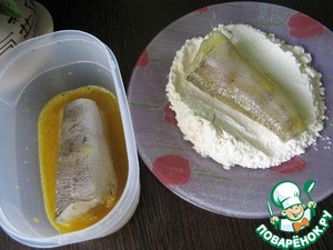 Обмакнуть рыбу в яичной смеси и обвалять в муке.