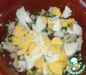 • Яйцо отварное очистить и нарезать крупными кусочками. Добавляем в салат.