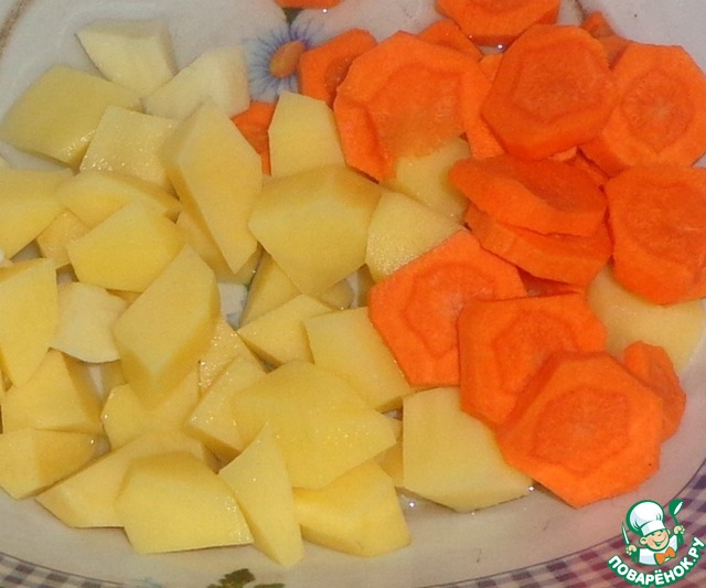 Сырой картофель очистить и нарезать кубиками. Морковь очистить и нарезать кружочками.