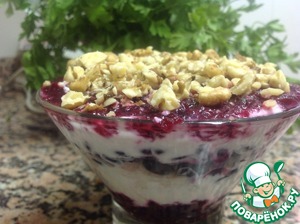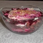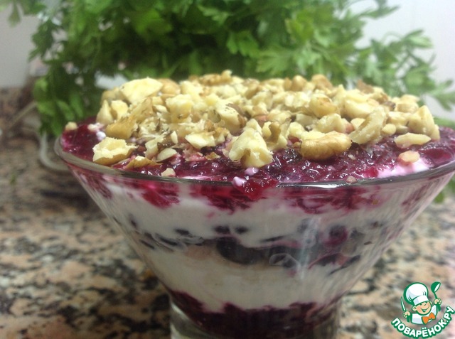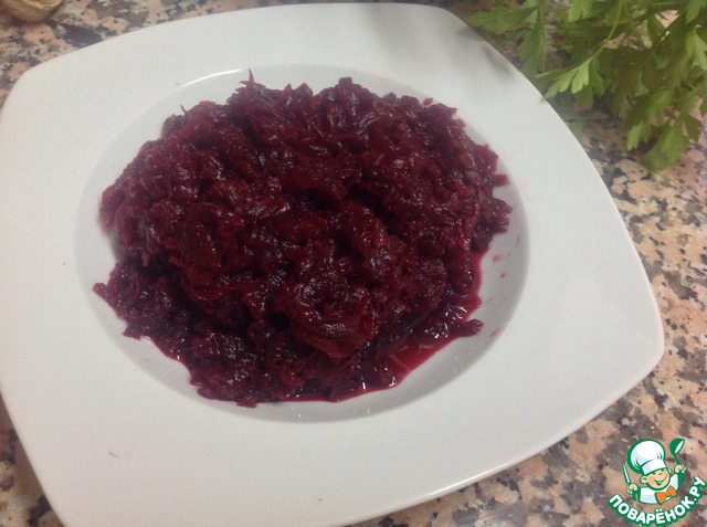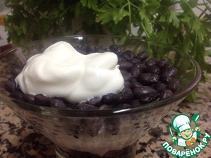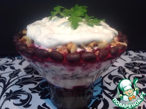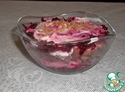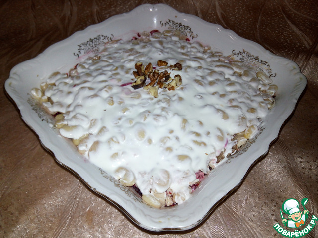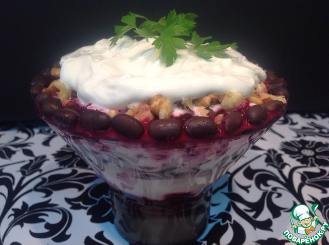 Следующий слой: свекла, чеснок, орехи и сверху сметана
