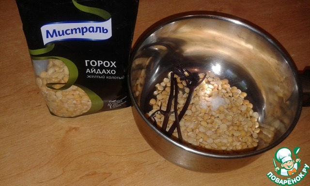 Сначала приготовим горох. Для этого необходимо поместить его в кастрюльку, добавить щепотку соли и веточки от базилика, залить водой и отварить до готовности