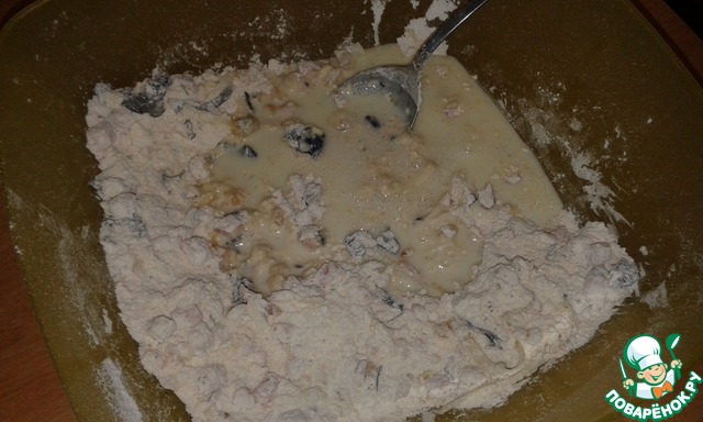 Перемешать. Влить яйцо, слегка взбитое венчиком с молоком