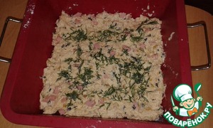 Еще раз хорошенько перемешать ложкой. Выложить в форму и посыпать сверху укропом