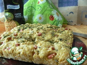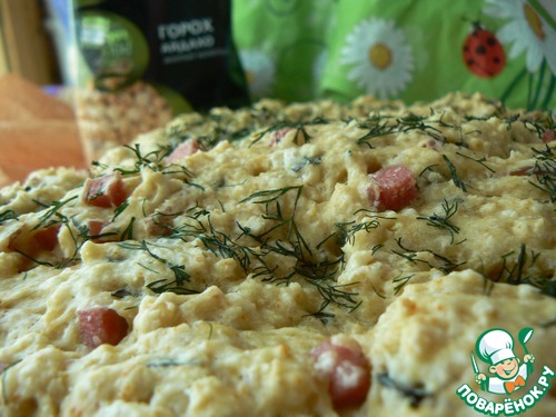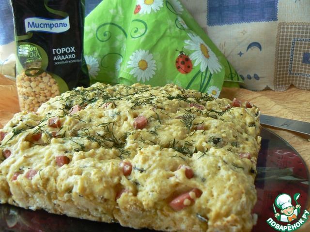 Легкий в приготовлении пирог с ароматом трав, колбаски и сыра с нежным воздушным мякишем и легкой корочкой сверху, дополненный горошком, придающим ореховый вкус, он прекрасно подойдет к чаю или обеду. Угощайтесь