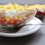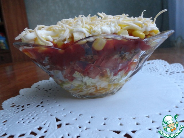 Кукурузу сцедить от жидкости и выложить следующим слоем