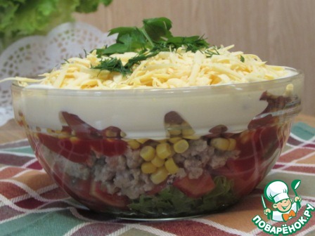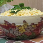 Этот салат - вариация по мотивам знаменитого блюда Чили кон карне, но в холодном варианте. Для большой компании на пикник или для праздничного стола жарким летним днем - просто взрыв вкуса! Попробуйте - это мега вкусно! Приготовление не занимает много времени, а бюджетность и разнообразие красок и вкусовых акцентов порадует и Вас, и гостей!
