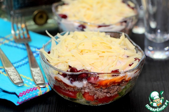 Этот салат очень красиво смотрится в прозрачной посуде.