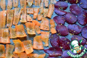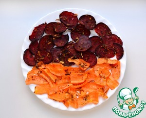 Приготовить овощные чипсы: свеклу, морковь, тонко порезать, уложить на противень, смазать растительным маслом при помощи кисти (чуть-чуть). Посыпать смесью из соли и приправ. Можно просто морской солью.