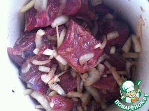 Ну а дальше... Лук чистим, моем и режем полукольцами. Добавляем к мясу и все хорошо перемешиваем. Оставляем мариноваться на ночь.