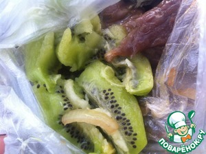 Сам киви нужно добавлять мах за 30 минут до того как собрались жарить мясо. Киви содержит кислоту, которая размягчает волокна мяса, если подержать в киви мясо больше времени оно будет распадаться прямо в руках! Поэтому... По приходу на природу киви чистим разминаем его руками и перемешиваем с мясом. Даем промариноваться 30 минут.