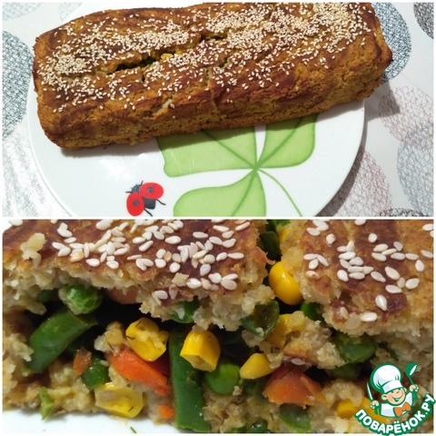 Далее кладём любую овощную смесь. В летний сезон, конечно, лучше использовать свежие овощи с грядки. Но пока у нас ещё не сезон, я взяла "Мексиканскую" замороженную овощную смесь. В её состав входят: красный болгарский перец, морковь, стручковая фасоль, зелёный горошек и кукуруза.