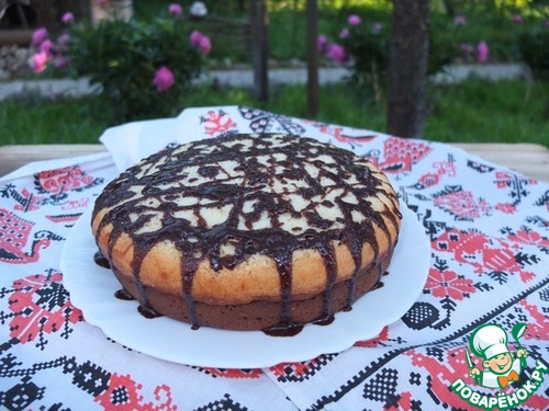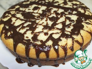 В чашу мультиварки, смазанную растительным маслом выливаем по очереди: шоколадный бисквит, творожную начинку, ванильный бисквит.